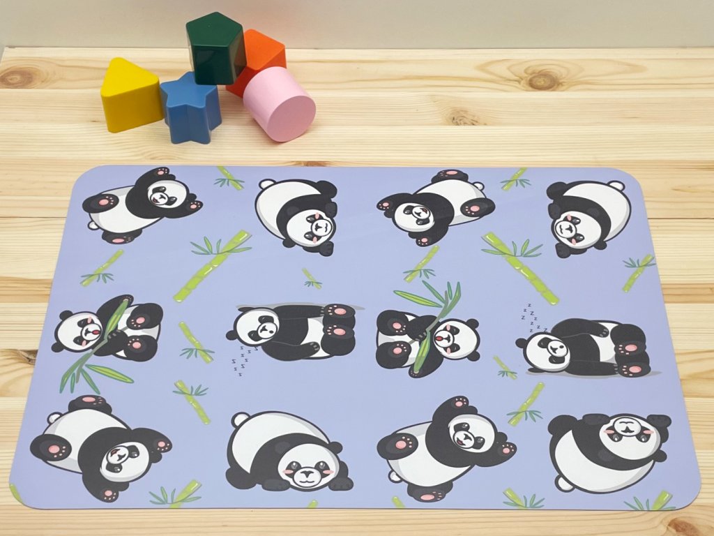 Roztomilé dětské prostírání na stůl s motivem pand na modrém pozadí. Vyrobeno z odolného plastového materiálu o tloušťce 0,7 mm, který je snadno omyvatelný a odolává teplotám do 70 °C. Ideální pro děti, které milují zábavné a praktické stolování. Vyrobeno v České republice.