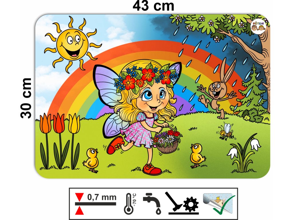 Probuďte jaro i u sebe doma! Toto plastové prostírání s veselým motivem přírody zachycuje kouzlo jarní louky s rozkvetlými květinami, poletujícími motýly a čmeláky, které si děti zamilují. Motiv je navržen tak, aby zaujal, podněcoval fantazii a zároveň ladil s dětským světem.