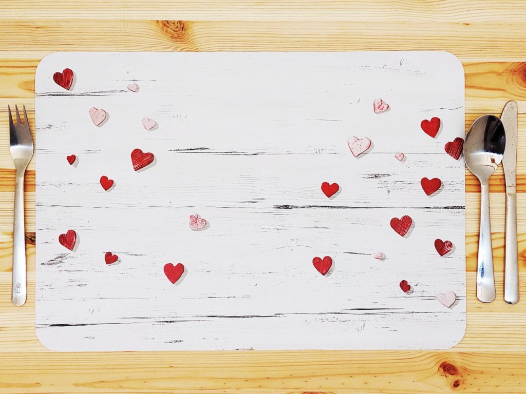 Valentýnské prostírání – Srdíčka na bílém dřevěném podkladu