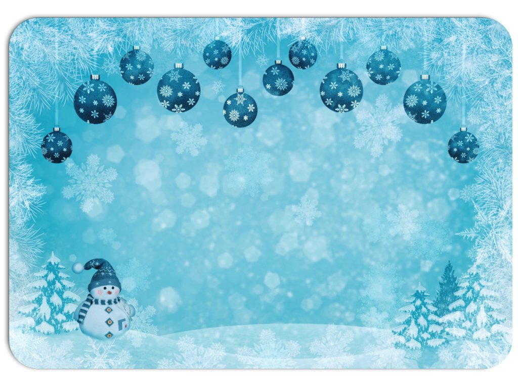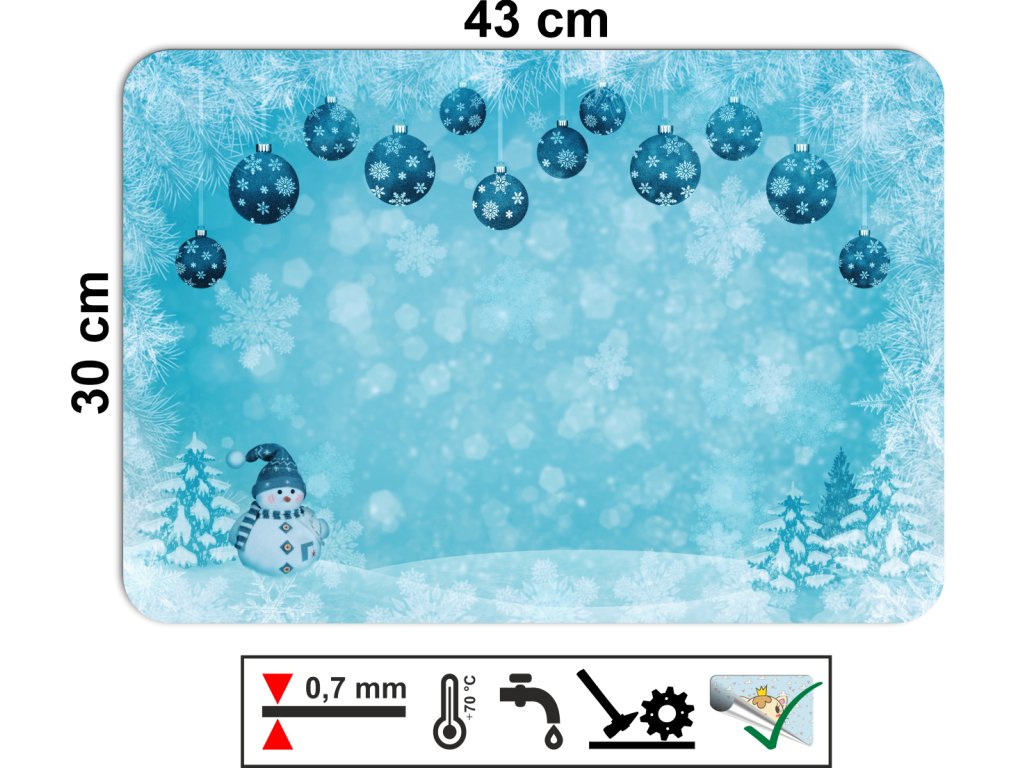 Krásné vánoční prostírání s modrými vánočními ozdobami a usměvavým sněhulákem vytváří kouzelnou zimní atmosféru. Modré pozadí doplněné jemnými sněhovými vločkami dodává dekoraci svěží a elegantní vzhled. Vyrobeno z odolného PVC, které se snadno čistí a je mechanicky odolné proti poškození. Lze jej ohýbat, zároveň odolává teplotám až do 70 °C. Díky ekologickému tisku s atestem pro dětské hračky je bezpečné pro celou rodinu. Ideální pro sváteční tabuli nebo zimní stolování. Vyrobeno v České republice.
