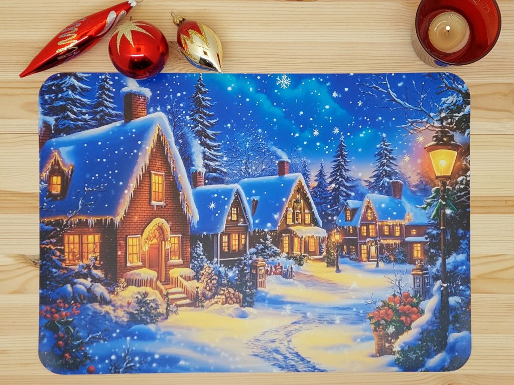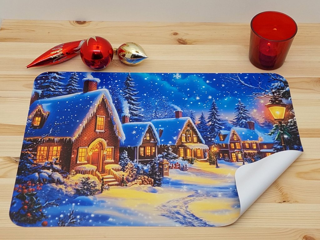 Vánoční prostírání s motivem pohádkové zimní vesničky navodí hřejivou atmosféru svátečního stolu. Detailní ilustrace zasněžených domků, svítících oken a vánoční výzdoby přináší jedinečný design. Hladký a mechanicky odolný PVC materiál umožňuje snadné čištění a flexibilní použití. Prostírání lze ohýbat, odolává teplotám do 70 °C a je potištěno ekologickými barvami s atestem pro dětské hračky. Rozměr 43 x 30 cm poskytuje ideální prostor pro každodenní i slavnostní stolování. Vyrobeno v České republice.