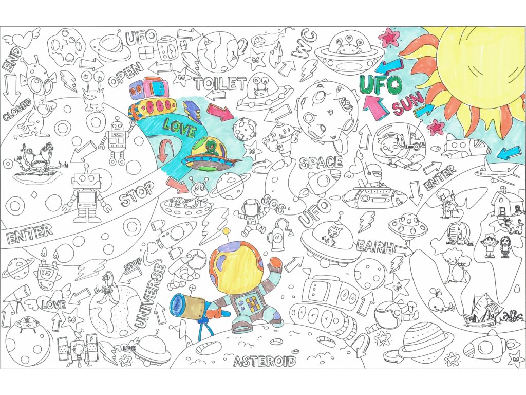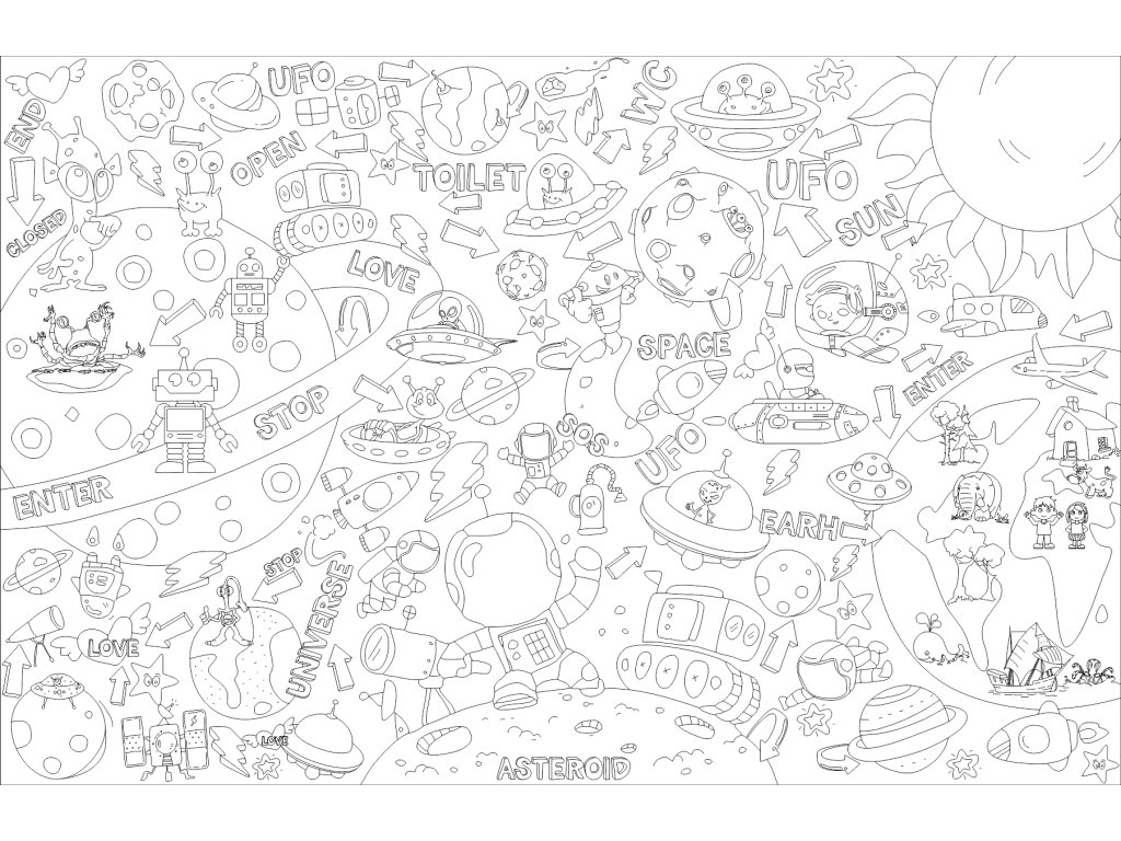 Maxi omalovánka s pestrým vesmírným světem je ideální pro dětské skupiny a mateřské školy. Motiv na formátu 100 x 65 cm zahrnuje mimozemšťany, planety, UFO, rakety, roboty a nápisy, které rozvíjejí řeč, orientaci a tvořivé myšlení. Vytvořeno jako čárová kresba na ofsetovém papíru s gramáží 120 g/m², vhodná pro pastelky, fixy i voskovky. Tento produkt podněcuje smyslové vnímání, jemnou motoriku a vizuální fantazii dětí. Vyrobeno v České republice.