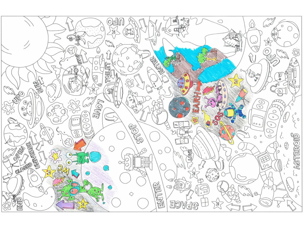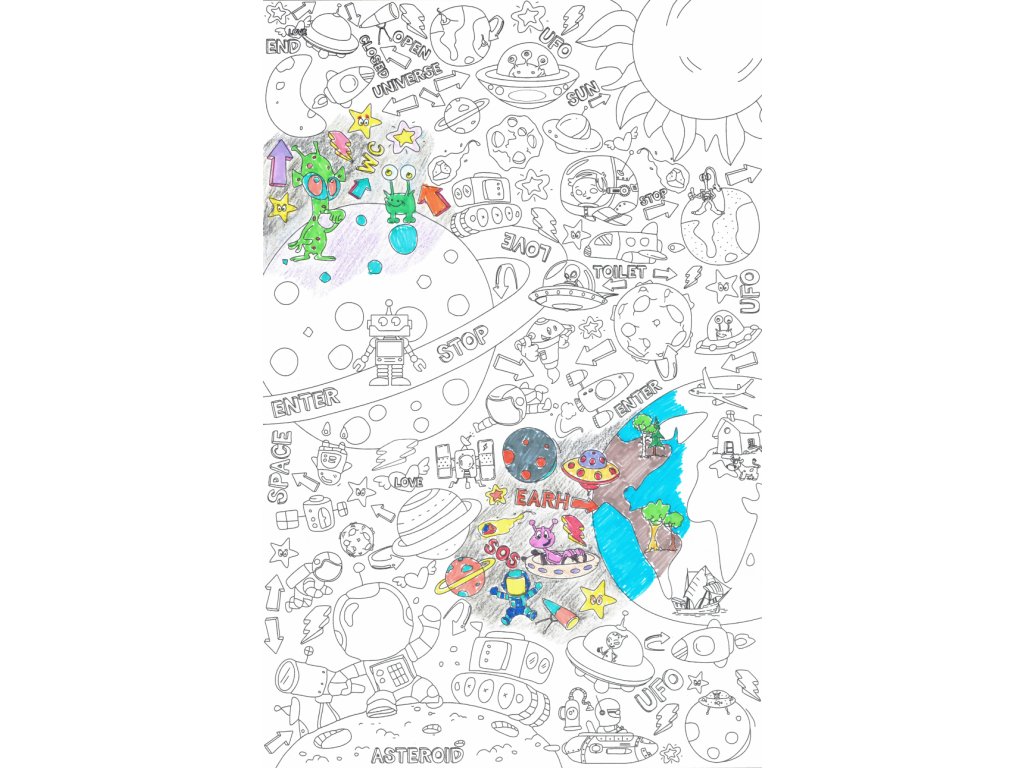 Velkoformátová černobílá omalovánka s vesmírným motivem přináší dětem zábavné prostředí k rozvoji jemné motoriky, představivosti i řečových dovedností. Na ploše 65 x 100 cm se nachází desítky hravých prvků jako planety, roboti, mimozemšťané, kosmonauti, rakety nebo slunce, které děti vybízejí ke tvořivému vybarvování. Motiv je vytištěn na kvalitním ofsetovém papíře s gramáží 120 g/m² a je vhodný pro pastelky, fixy i voskovky. Vyrobeno v České republice.