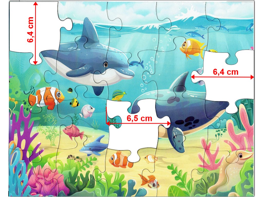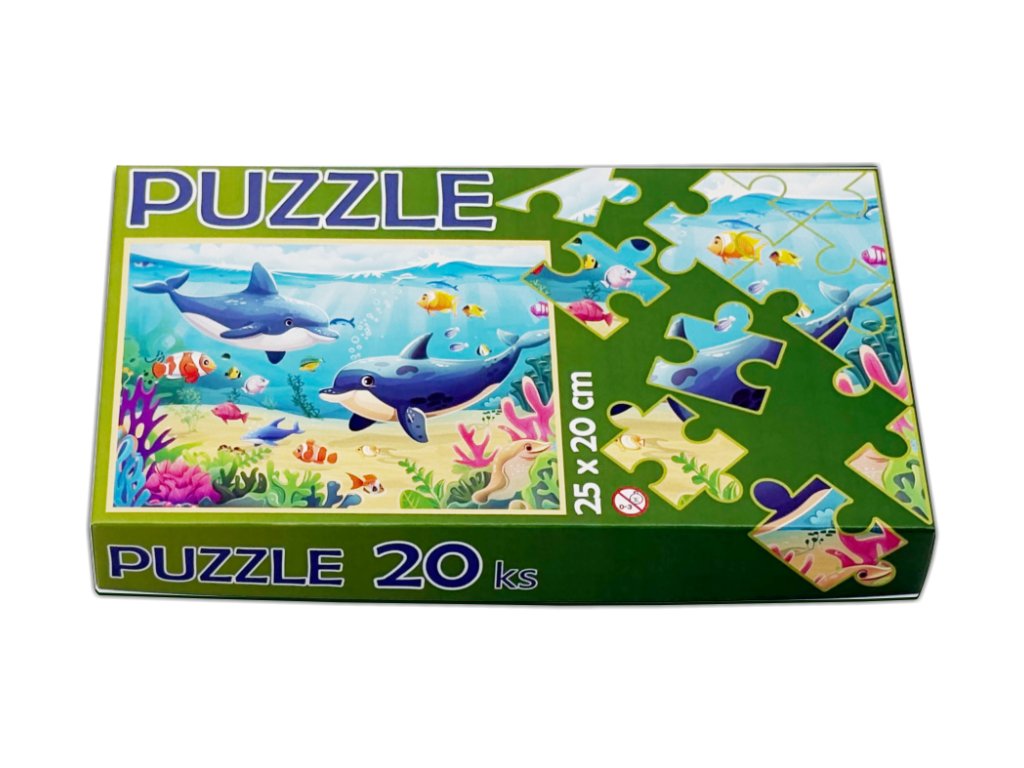 Dětské puzzle s motivem delfínů pod mořem přenese děti do barevného světa oceánu plného rybiček, korálů a přátelských mořských savců. Díky menšímu počtu 20 dílků je puzzle vhodné pro první skládání a pomáhá rozvíjet jemnou motoriku, logické myšlení i trpělivost dětí.
