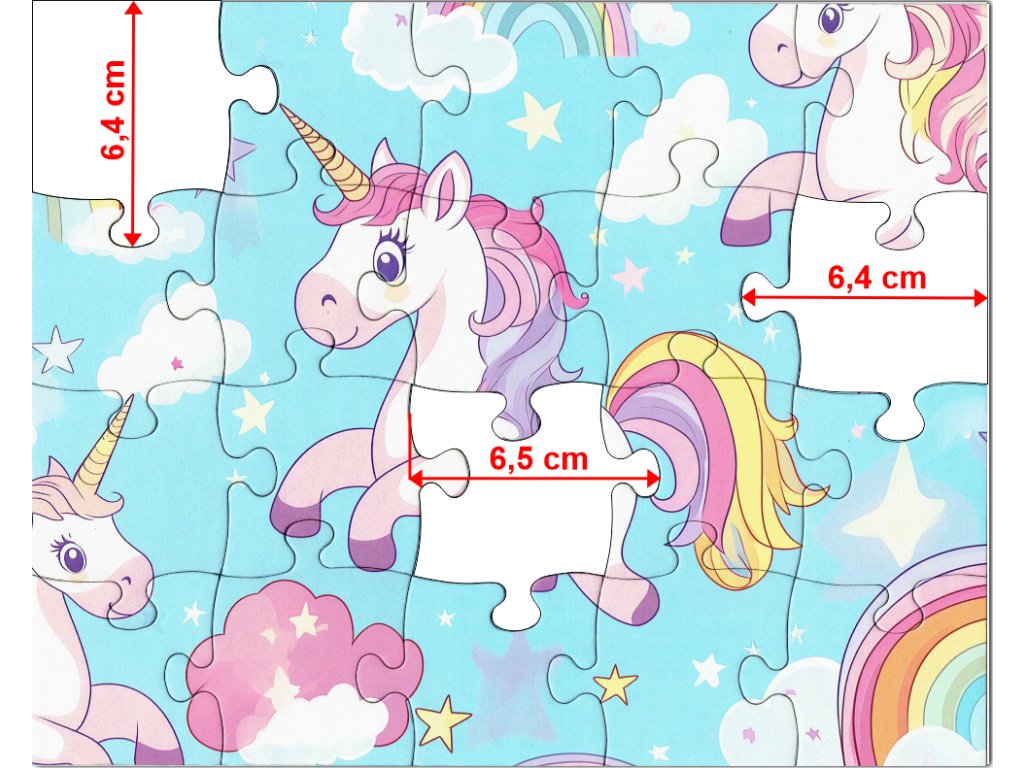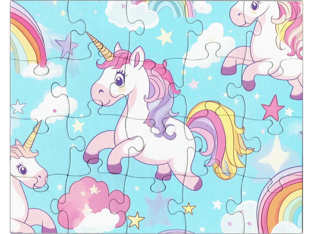 Dětské puzzle s motivem duhy a jednorožců přenese děti do kouzelného světa plného barev, obláčků a pohádkových bytostí. Jemné pastelové tóny, hvězdičky a duhy podporují dětskou fantazii a vytvářejí klidnou, hravou atmosféru při skládání.
