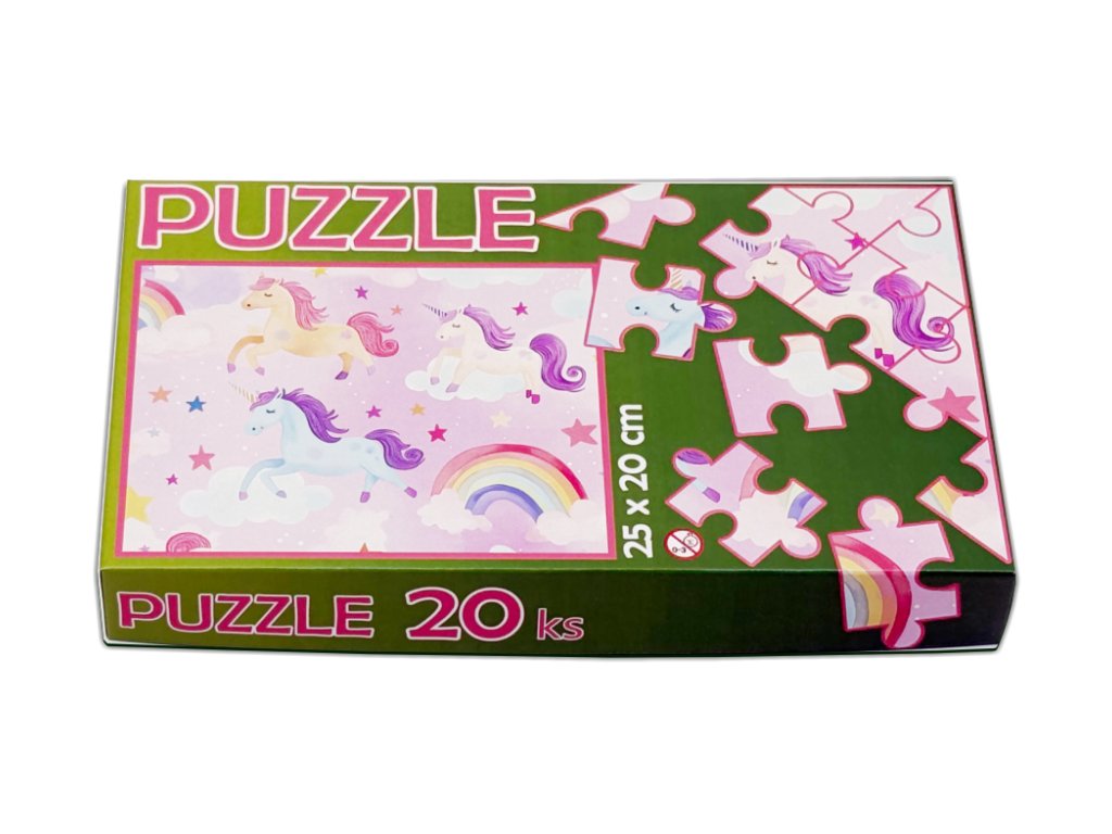 Dětské puzzle Jednorožci a duha na růžové – 20 dílků, 25 x 20 cm