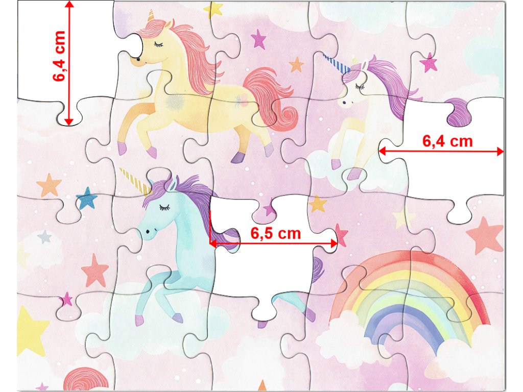 Dětské puzzle s motivem jednorožců a duhy na růžovém pozadí vytváří pohádkovou atmosféru plnou jemných barev, hvězdiček a obláčků. Ilustrace působí klidně a snově, díky čemuž je puzzle ideální pro menší děti a chvíle soustředěné hry.