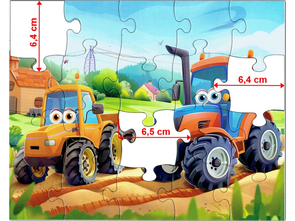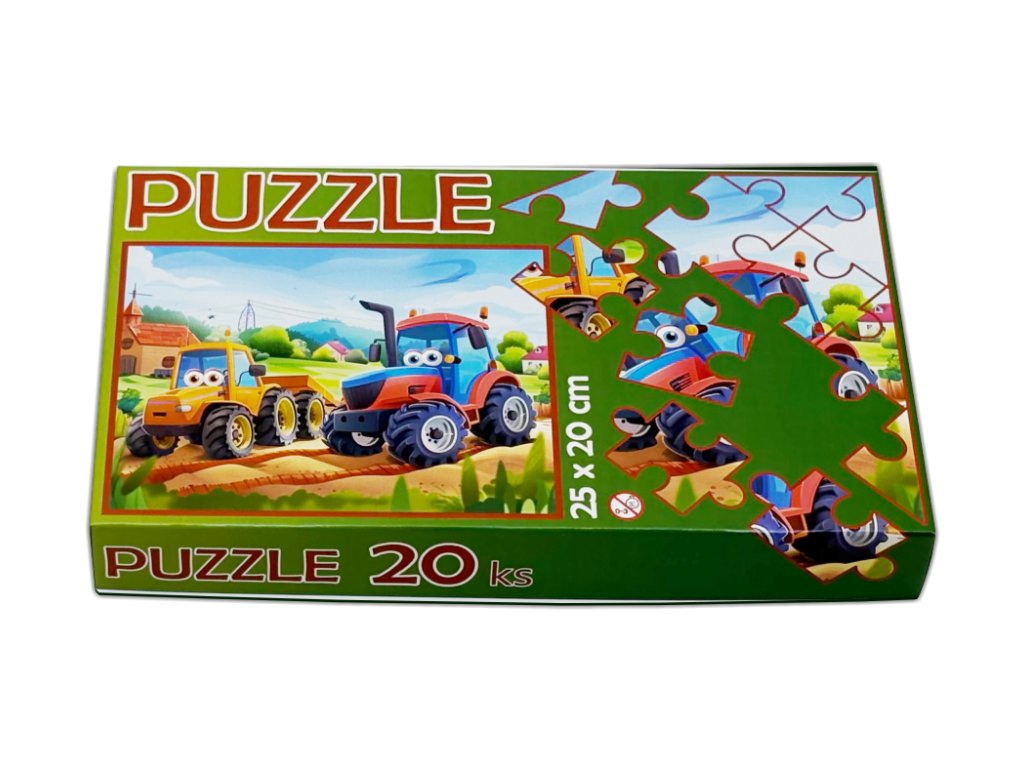 Dětské puzzle s motivem veselých traktorů na poli přenese děti do světa venkova, práce na farmě a zemědělských strojů. Barevná ilustrace s usměvavými traktory podporuje fantazii a dělá ze skládání zábavnou hru. Díky 20 dílkům je puzzle vhodné jako první skládačka pro menší děti a pomáhá rozvíjet jemnou motoriku, trpělivost i schopnost soustředění.